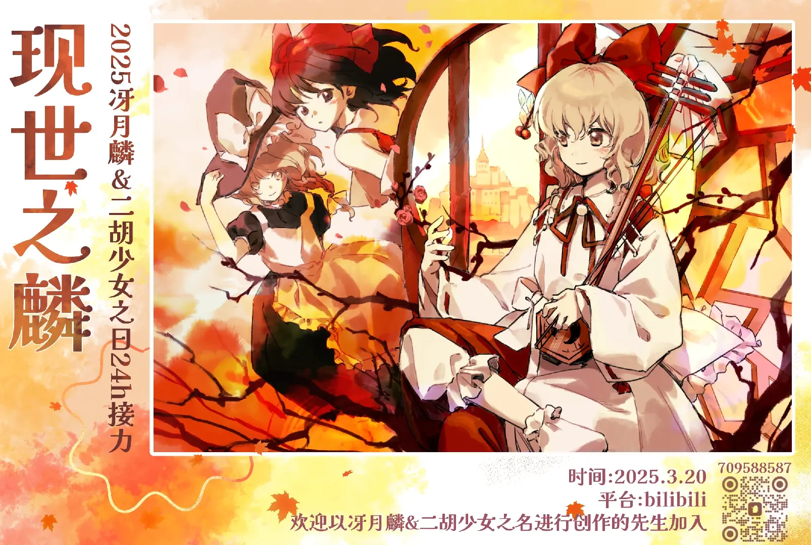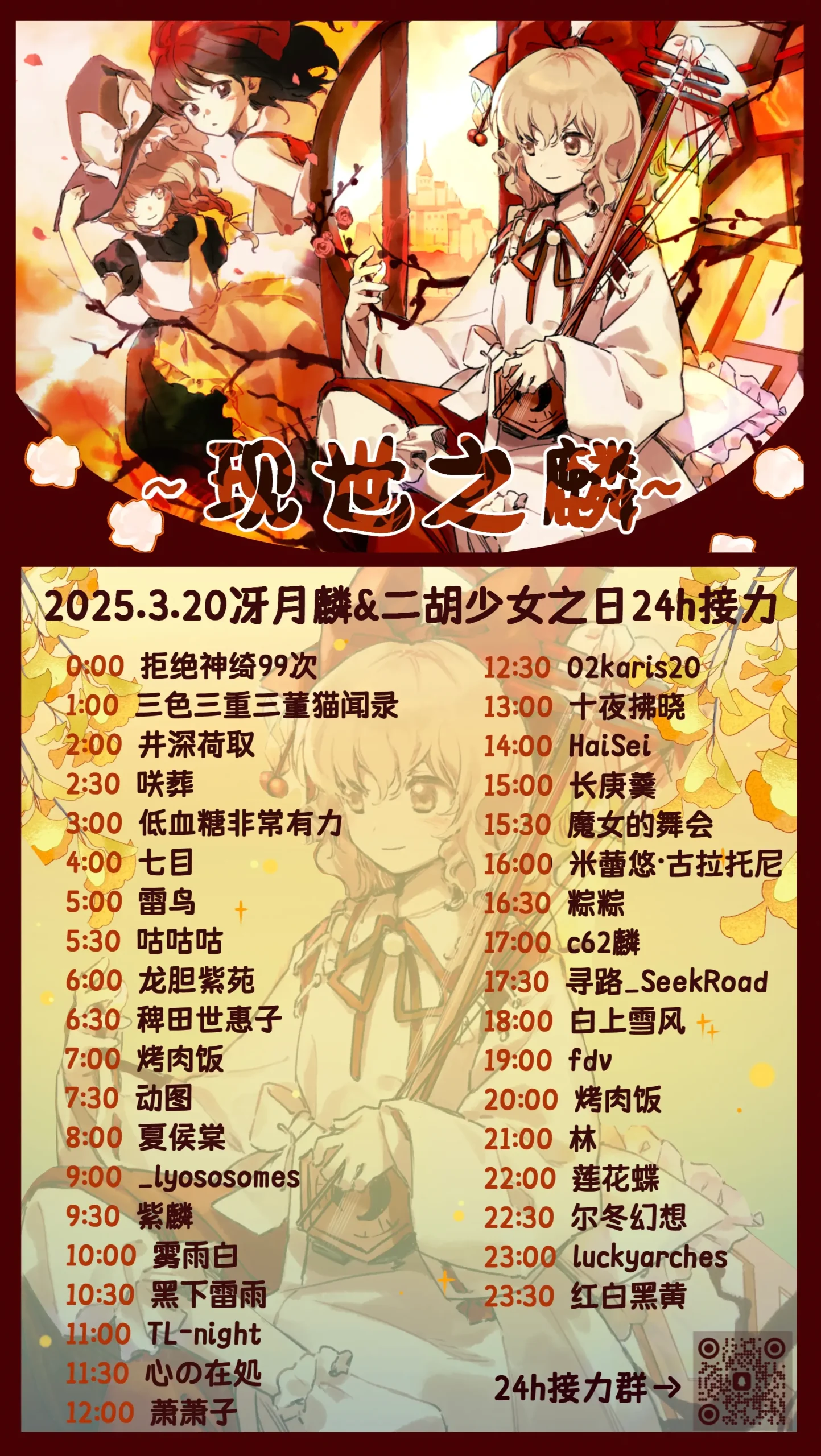 第二届现世之麟-冴月麟24h接力活动。 2026年3月20日是冴月麟 & 二胡少女 24h接力,3「さ」2「つ」き 0「りん」,冴月麟(さつき りん)。是为了庆祝冴月麟之日而举办的接力活动,本次活动共计34棒。